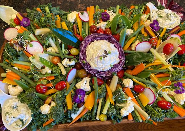 Farm fresh seasonal organic vegetables paired with three dipping sauces. Includes rainbow carrots, celery, green beans, purple cauliflower, baby corn, broccoli, cucumbers, heirloom tomatoes, red radish, watermelon radish, snap peas, baby bell peppers, dill dip, beet hummus & classic hummus