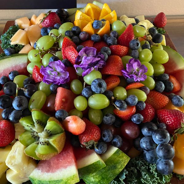 A delightful arrangement of seasonal fruit. Pineapple, cantaloupe, watermelon, oranges, kiwi, dragon fruit, star fruit, strawberries, black berries blueberries, raspberries, decorated with floral