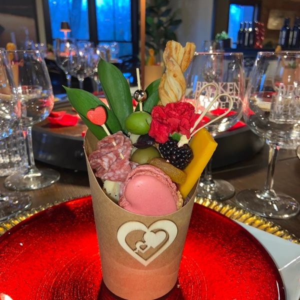 Grab and Go! Let your guests mingle with a hand held charcuterie cup! Filled with salami, cheese, olives, nuts, pretzels, dried apricot, macaroon & cheese straw, served in a custom cup