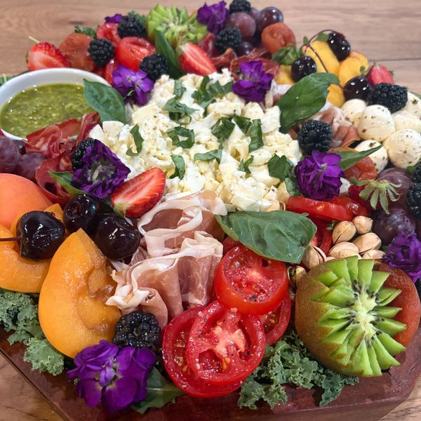 Burrata cheese, fresh vegetables prosciutto, cherry tomato, pesto, olive tamponade,fresh basil, crostini & crackers